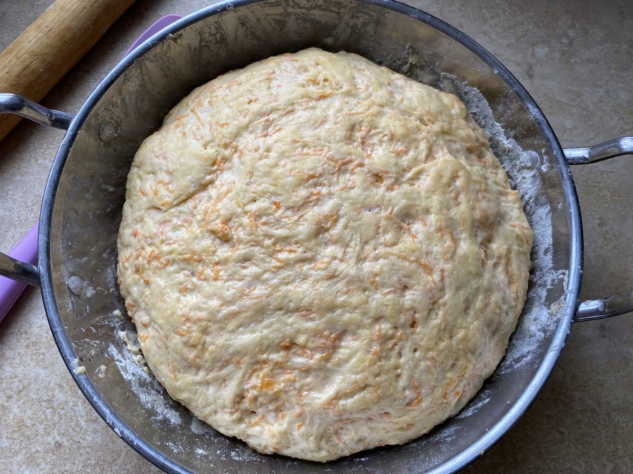 Коли опара «оживе», почне пінітися і трохи підійметься, на що може піти від 10 до 20 хвилин, додаємо до опари натертий гарбуз і всі інші інгредієнти, замішуємо тісто. Верх тіста змащуємо олією, накриваємо миску рушничком і ставимо на підхід приблизно на годину-півтори в тепле місце.