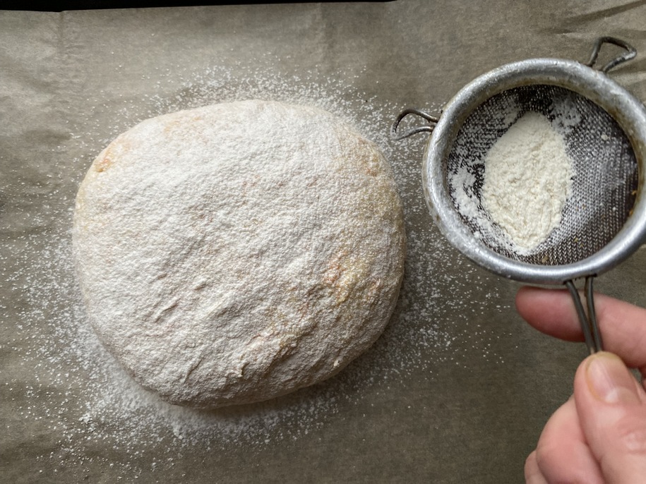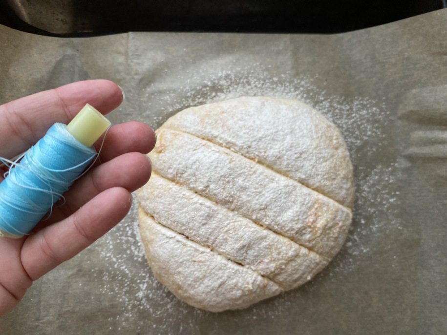 Викладаємо її на пергамент, посипаємо борошном (зручно це робити через дрібне сито) і або дуже тонким, гострим ножем (можна навіть канцелярським), або тонкою шовковою ниткою робимо розрізи на хлібині.